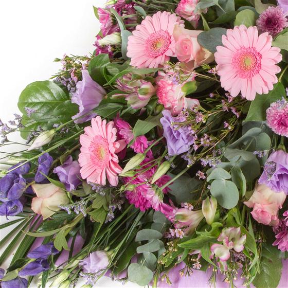 A pretty bouquet in lilacs and pinks including aconitum, carnations, gerberas, wax flower and complementing foliage.