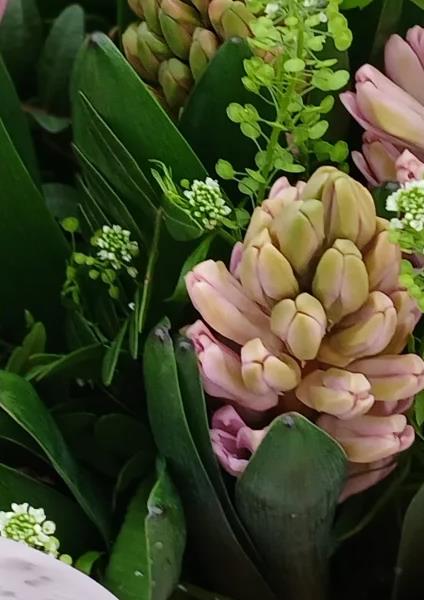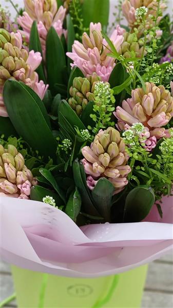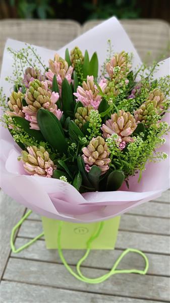 This wonderful handtie bouquet is made of pink hyacinth and soft thlaspi. Not tall, not imposing but having a lot to say with its scent. Wrapped in soft pink cellophane and delivered in water.