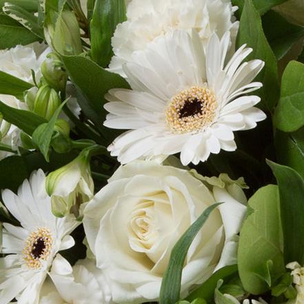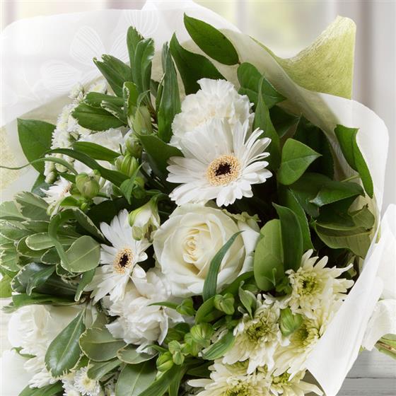 A simple hand-tied bunch of cream and white blooms including gerberas, chrysanthemums, carnations and alstromeria.